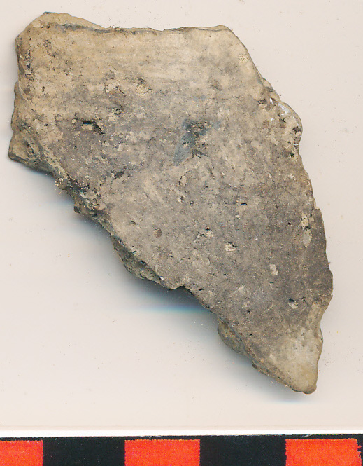 Sárgásszürke, simított külső felületű, korong nélkül készített edény vékony falú, íves oldaltöredéke.