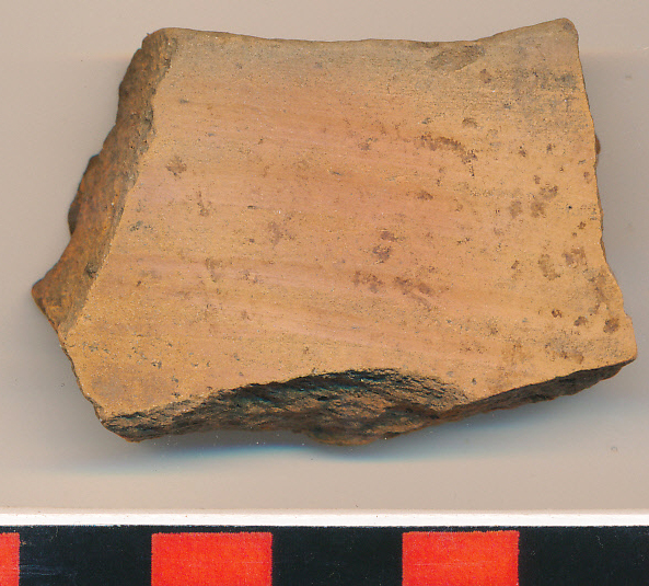 Téglaszínű, korongolt, igen vastag falú edény külső felületén vízszintesen szépen simított oldaltöredék.