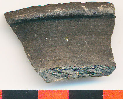 Fekete, szendvicses fekete-barna törésű, kissé homokos anyagú, vékony falú, korongolt fazék kihajló, ferdén levágott peremtöredéke.