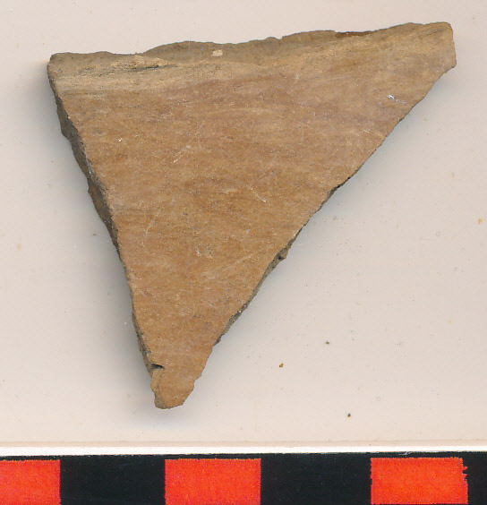 Kívül vízszintesen barnára, szinte porcelánszerűre polírozott felület, fekete törésű kisebb oldaltöredék.