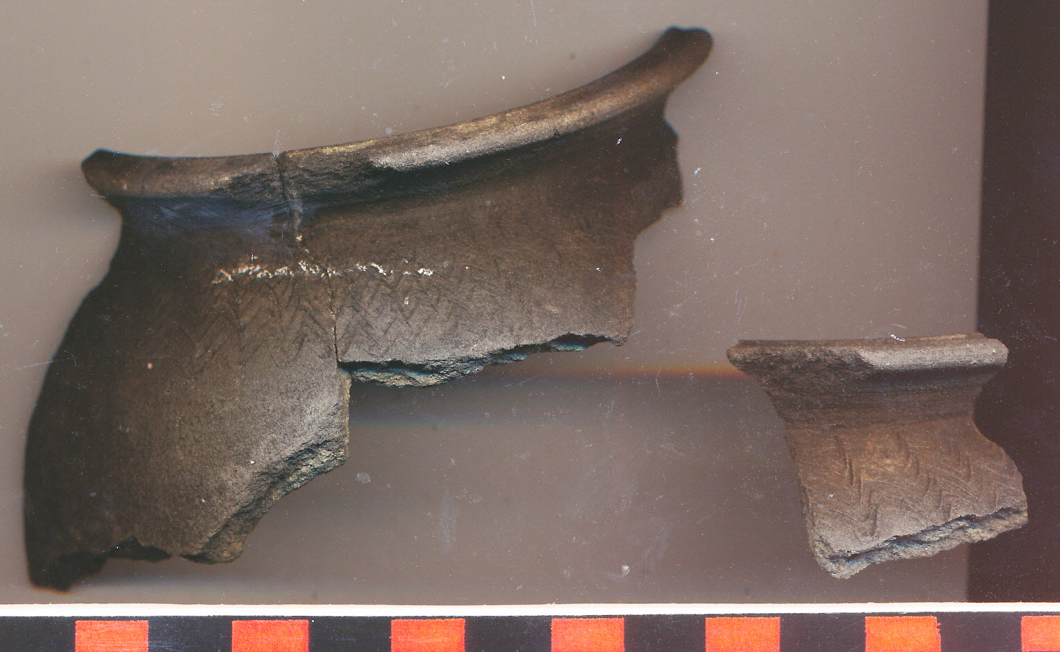 Fekete, kisebb fazék ferdén kihúzott, kissé tagolt pereme, erősen íves nyakkal, gömbölyű vállal, a vállon, ahol 1,2 cm széles sávban sűrű befésült cikkcakk köteggel. Az egyik 2 db-ból ragasztott.