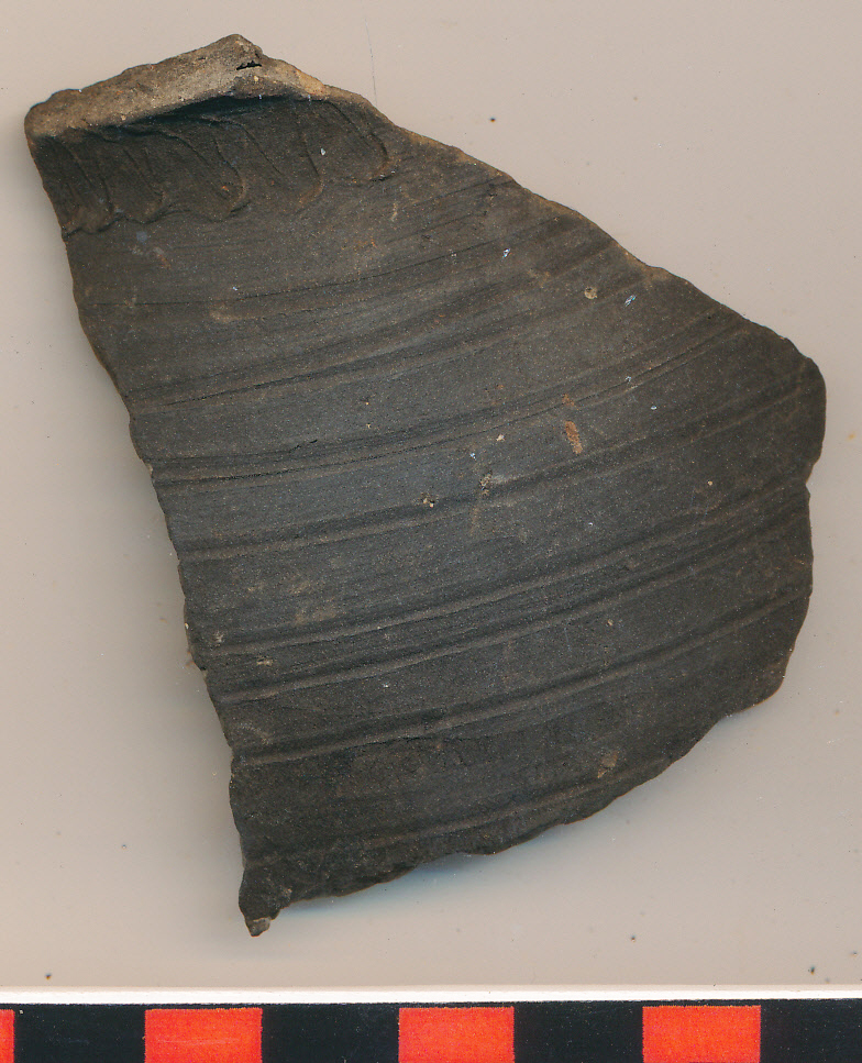 Fekete, kevés homokkal soványított, korongolt edény gömbölyded válla, íves nyak indításával. A nyak tövében sekély bekarcolt cikkcakk vonallal, a vállon sűrű, karcolt, szabálytalanul körbefutó vonallal.