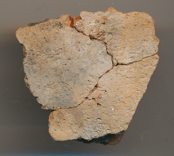Téglaszínű külső-belső felületű, fekete törésű, kerámiazúzalékkal soványított, korong nélkül készített edény eldolgozott anyagú oldaltöredéke.