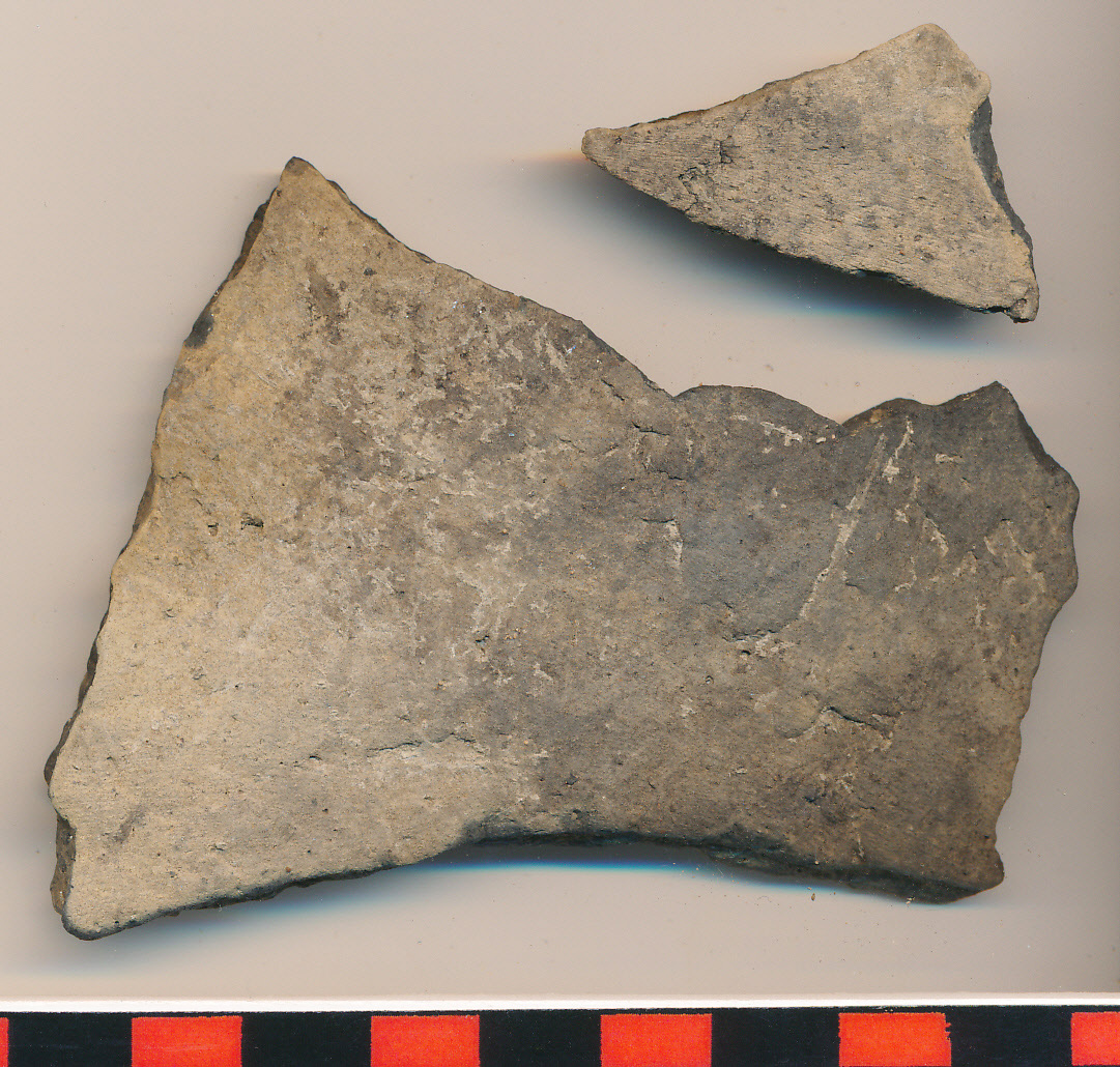 Kívül sárga-fekete foltos, belsejében világossárga, fekete törésű vékony falú nagyobb edény két oldaltöredéke.