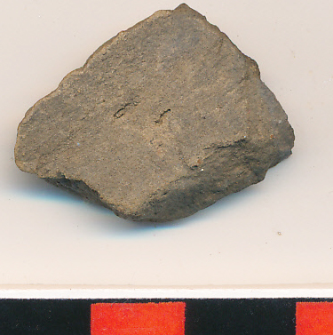 Fekete, külső felületén sárgás, homokos anyagú, korongolt, vékony falú edény kopott oldaltöredéke.