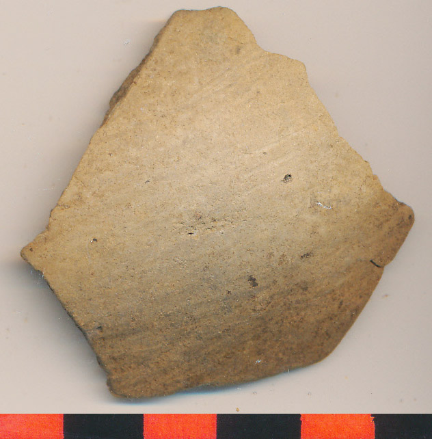 Kívül-belül drapp, jól elsimított felületű, fekete törésű, vékony falú edény gömbölyű hasának töredéke.