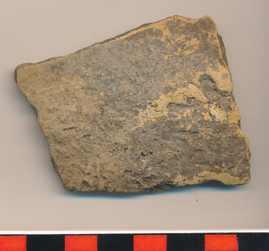 Téglaszínű külső felületű, belső felületén jól eldolgozott, kívül egyenetlen, szürke törésű enyhén íves oldaltöredék.