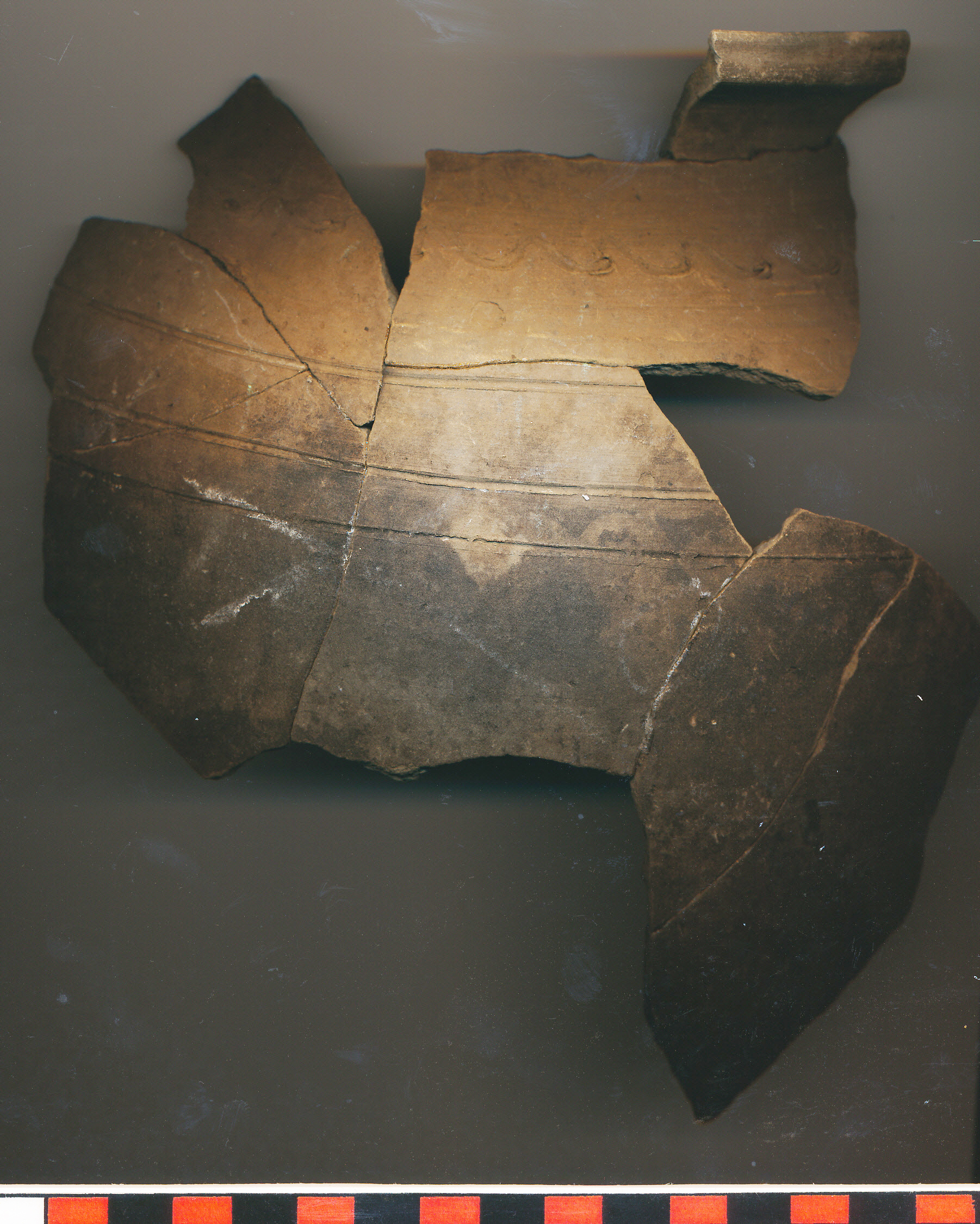 Sötétszürke, fekete foltos, kormos külső felületű, kissé homokos anyagú, vékony falú, korongolt fazék íves válla és oldala7 db-ból ragasztva. Vállán bekarcolt körbefutó hullámvonal alatt 3 körbefutó karcolt vonal díszíti. Hozzáragasztva a 2015.161.27. peremtöredék.