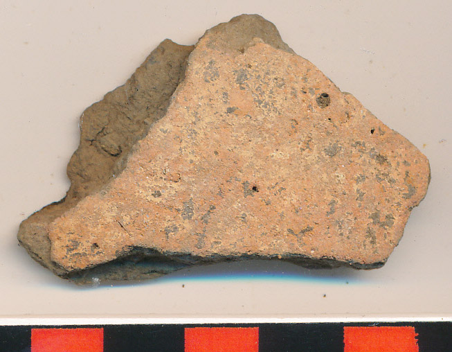 Kívül téglaszínű, belül sárga, érdes felületű, fekete törésű kopott, egyenes oldaltöredék.