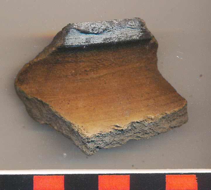 Kívül-belül téglaszínű, szürke törésű, vastag falú, homokkal soványított, korongolt edény kihajló, elvékonyodó, ferdén vágott pereme, erősen íves nyakkal.