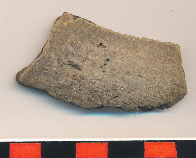 Feketésbarna, vékony falú edény íves, kopott hastöredéke.