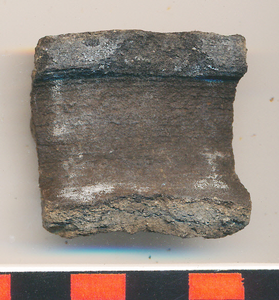 Fekete külső felületű, belül szürke, homokos anyagú, korongolt, vastagabb falú edény kissé kihajló, elvékonyodó, ferdén vágott pereme.