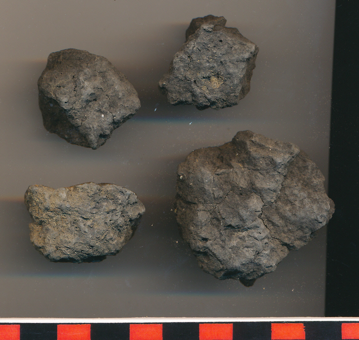 Szabálytalan alakú, feketére égett agyagrögök. Többet eltettünk anyagvizsgálathoz leltári szám nélkül.
