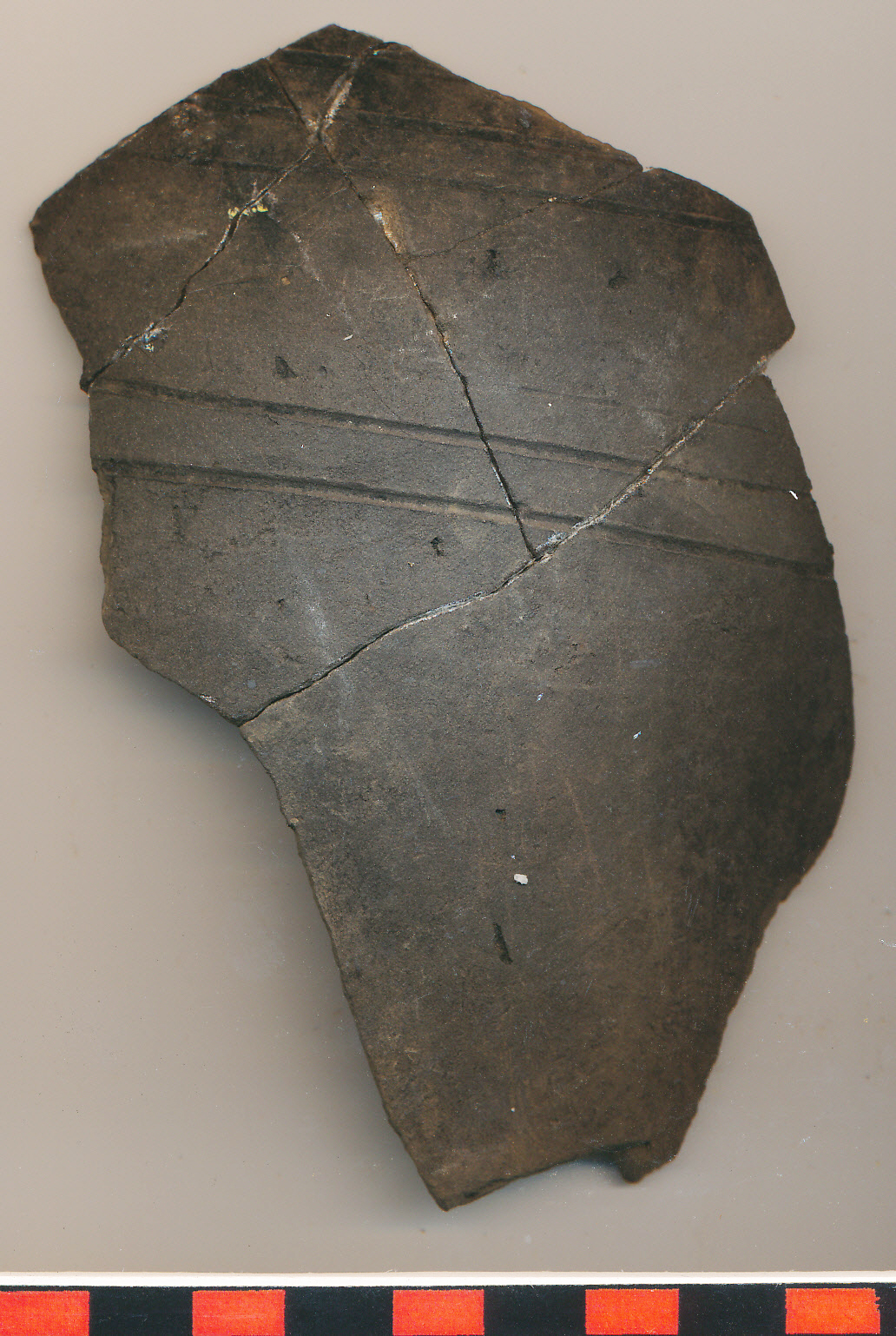 Fekete, kissé homokos anyagú, vékony falú, korongolt fazék íves oldala bekarcolt körbefutó 3+2 vonal díszíti. A 2015.161.13. töredéke (össze is jön vele, de nincsenek összeragasztva) 6 db-ból ragasztott.