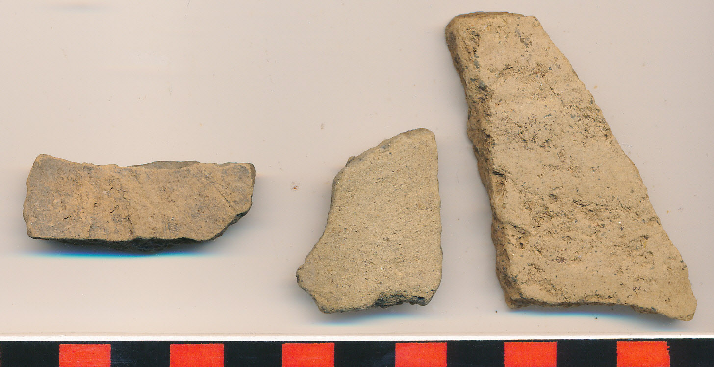 Kívül sárga felületű, fekete törésű egyenes falú, jellegtelen oldaltöredékek.