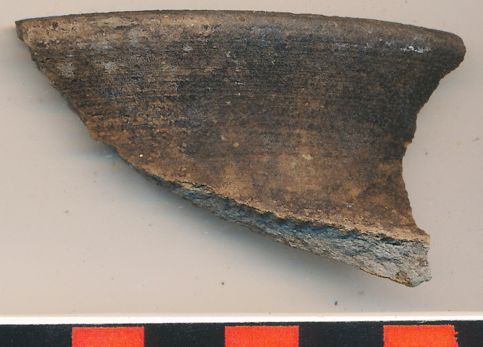 Kívül fekete foltos barna külsejű, belsejében drapp felületű, szürke törésű, homokos anyagú, korongolt edény kissé kihajló, ferdén vágott pereme az íves nyak indításával.