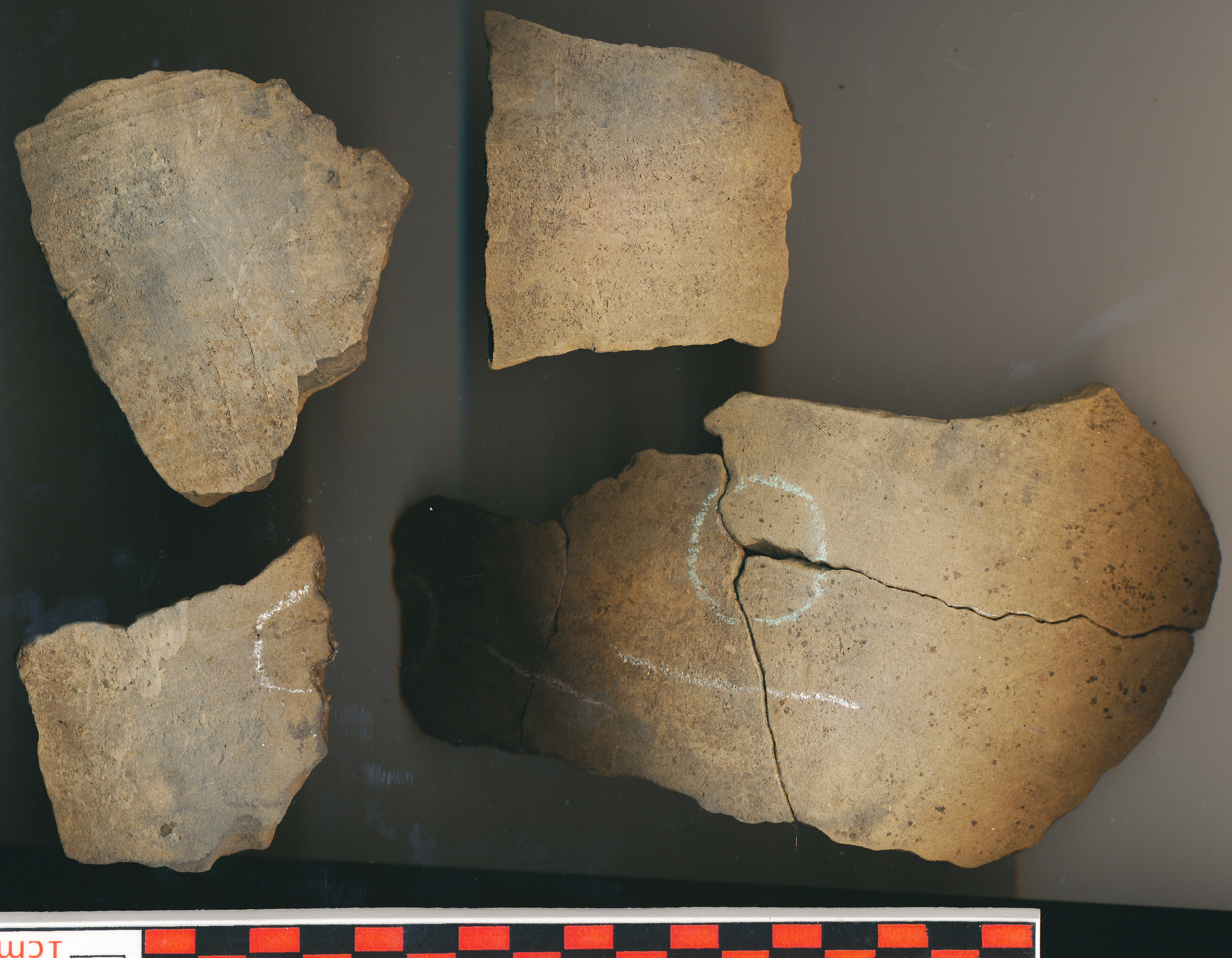 Szürke, kívül-belül fekete foltos, homokos anyagú, korongolt nagyobb edény töredékei.