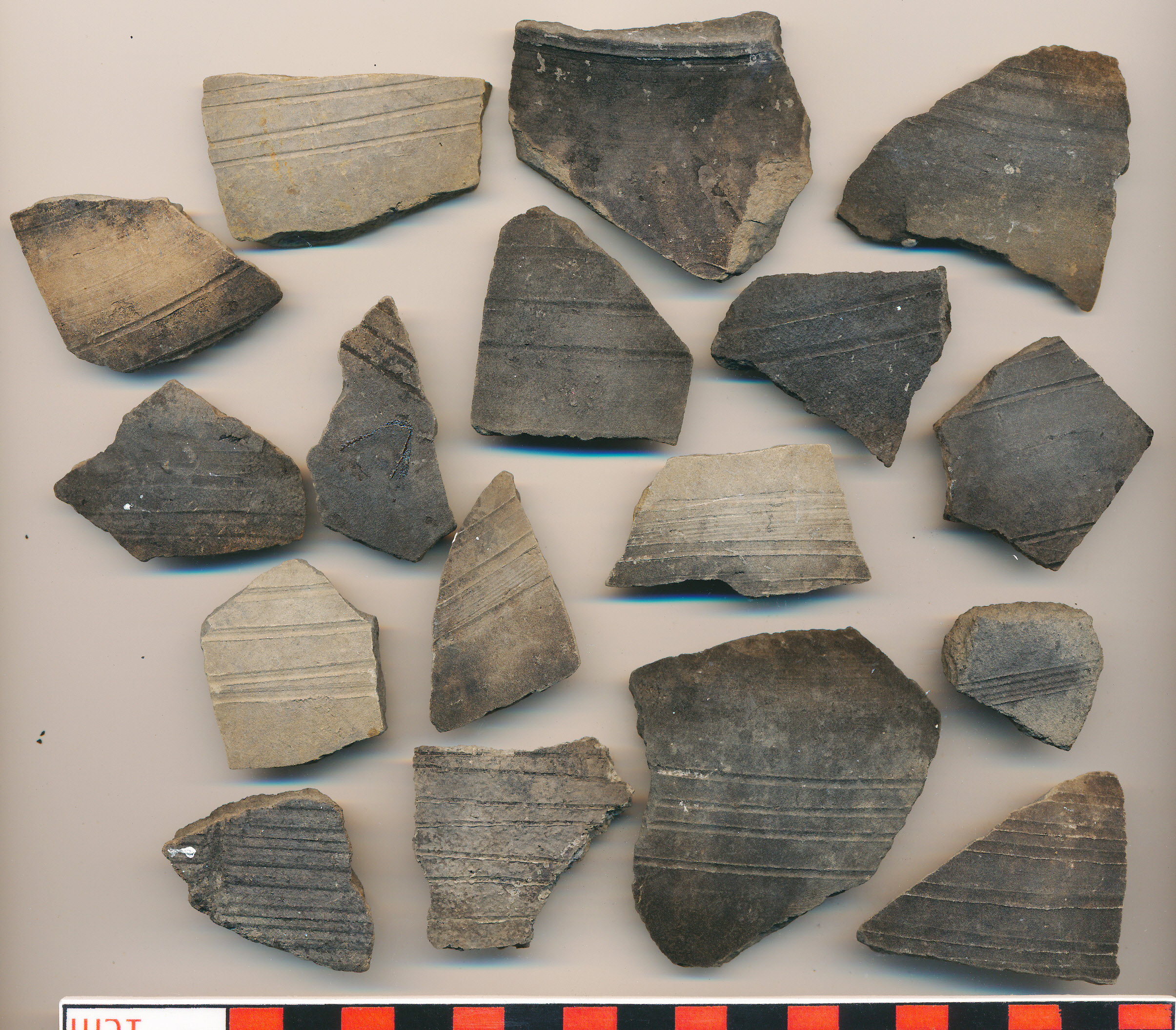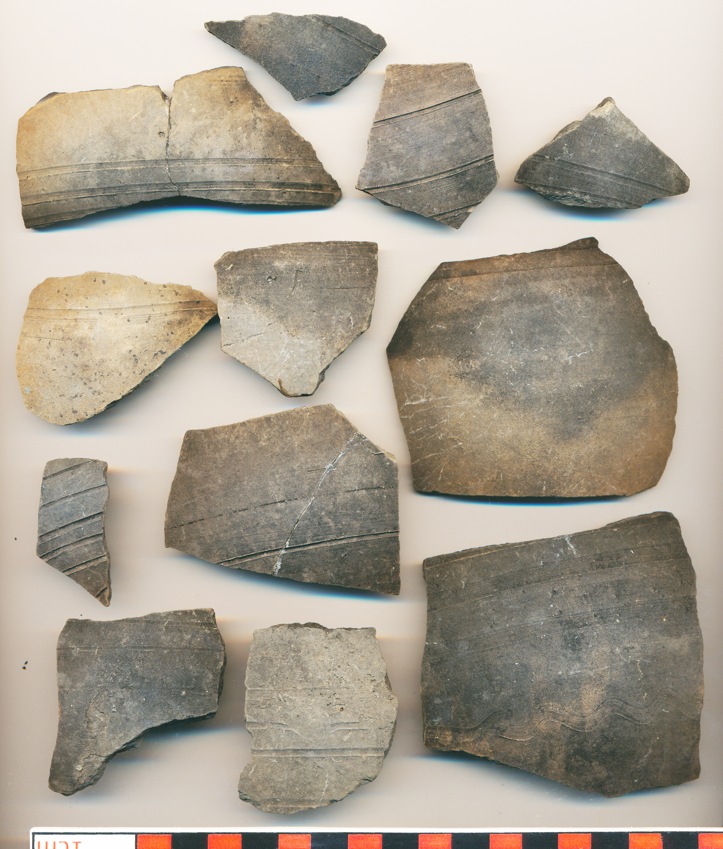 Többségében fekete, illetve szürke, korongolt, kissé homokos anyagú, vékony falú edény ek oldaltöredékei zömében karcolt vonalas dísszel, egyiken karcolt hullámvonallal, egy másikon befésült vonalköteggel.