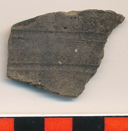 Fekete, homokos anyagú, korongolt, vékony falú edény töredéke 2 benyomott körbefutó vonallal.