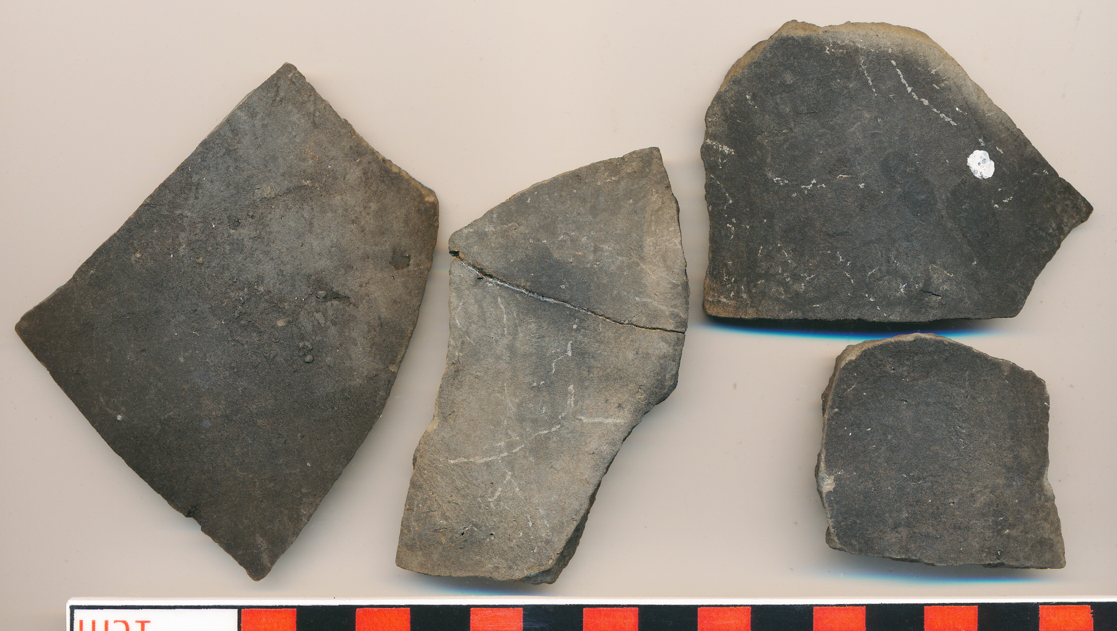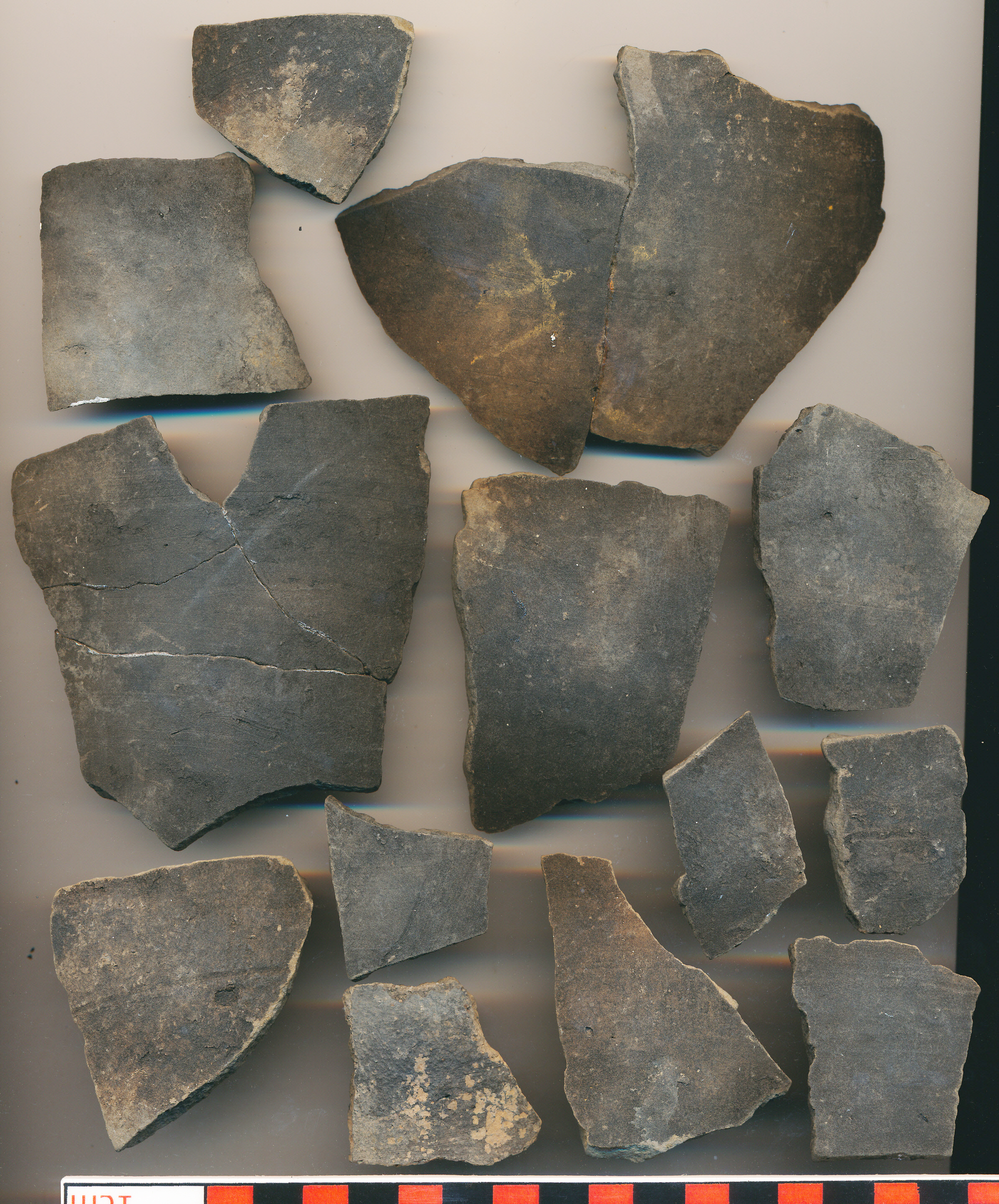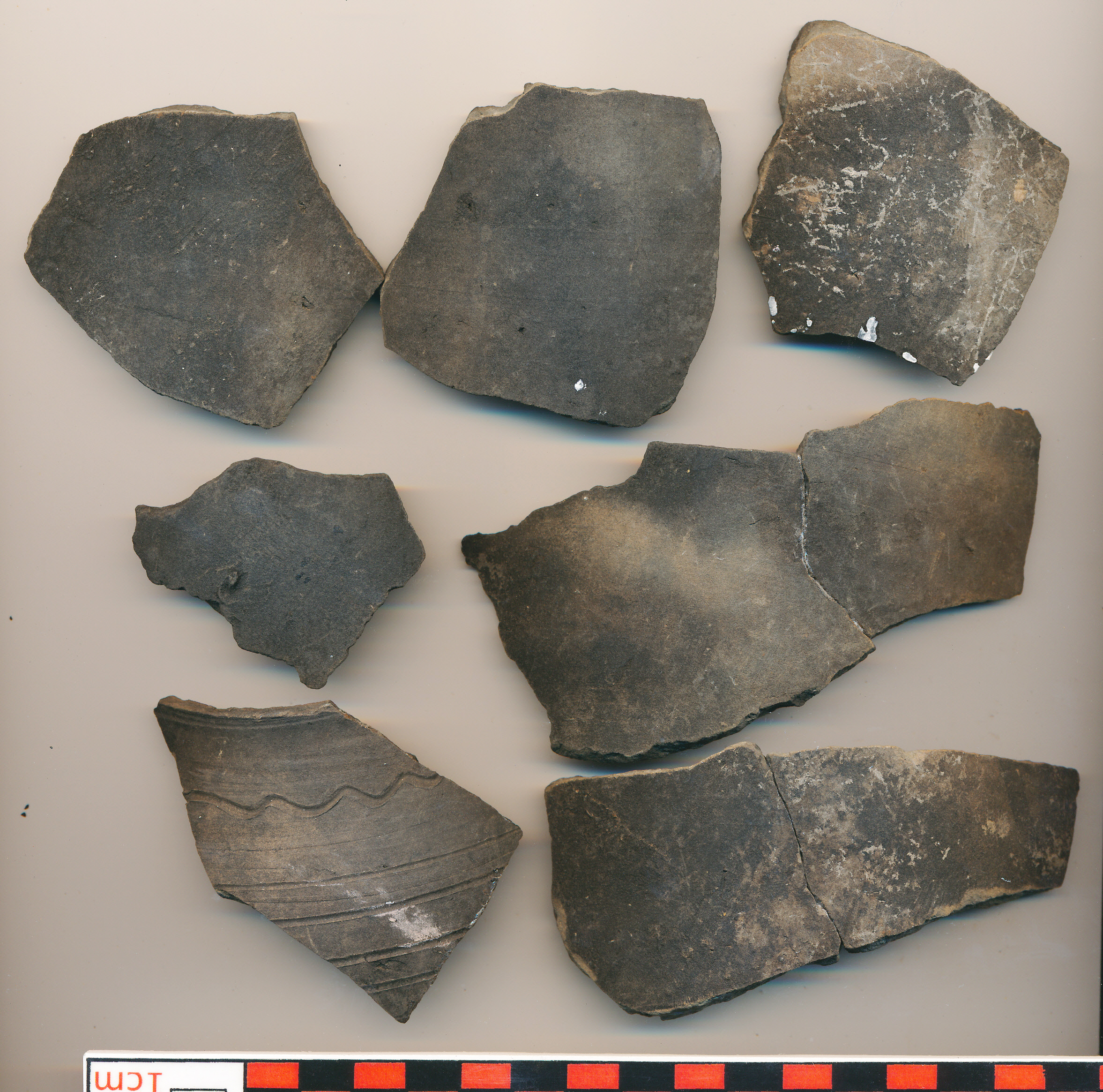 Többségében fekete, illetve szürke, korongolt, kissé homokos anyagú, vékony falú edények díszítetlen oldaltöredékei. Az egyiken karcolt hullámvonal alatt karcolt több körbefutó vonal.