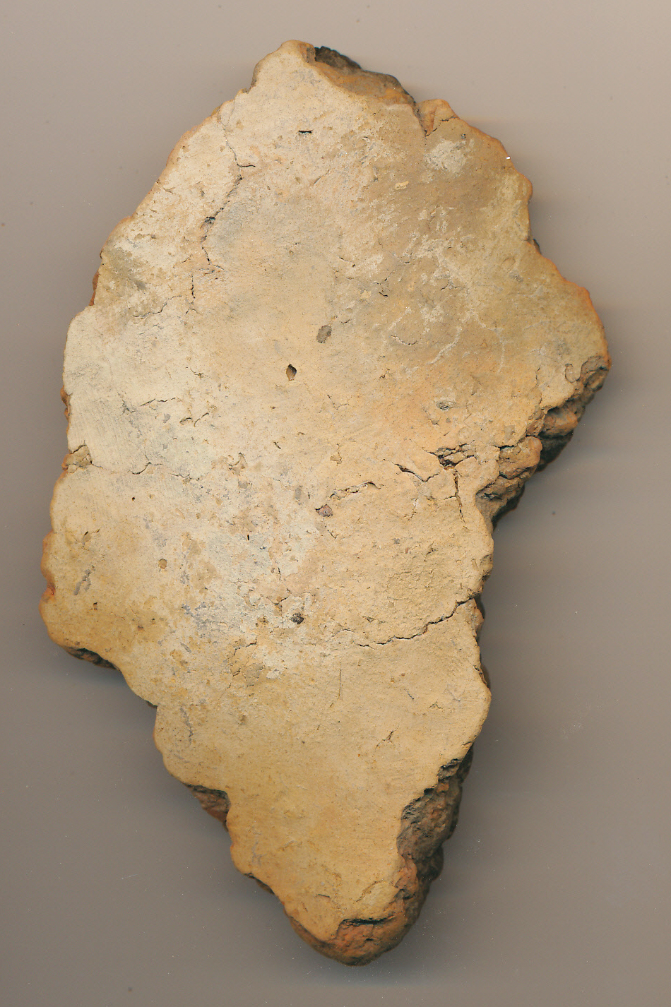 Téglaszínű külső felületű, fekete törésű, korong nélkül készített, kerámiazúzalékkal soványított nagyobb edény vastagabb falú, enyhén íves oldaltöredéke.