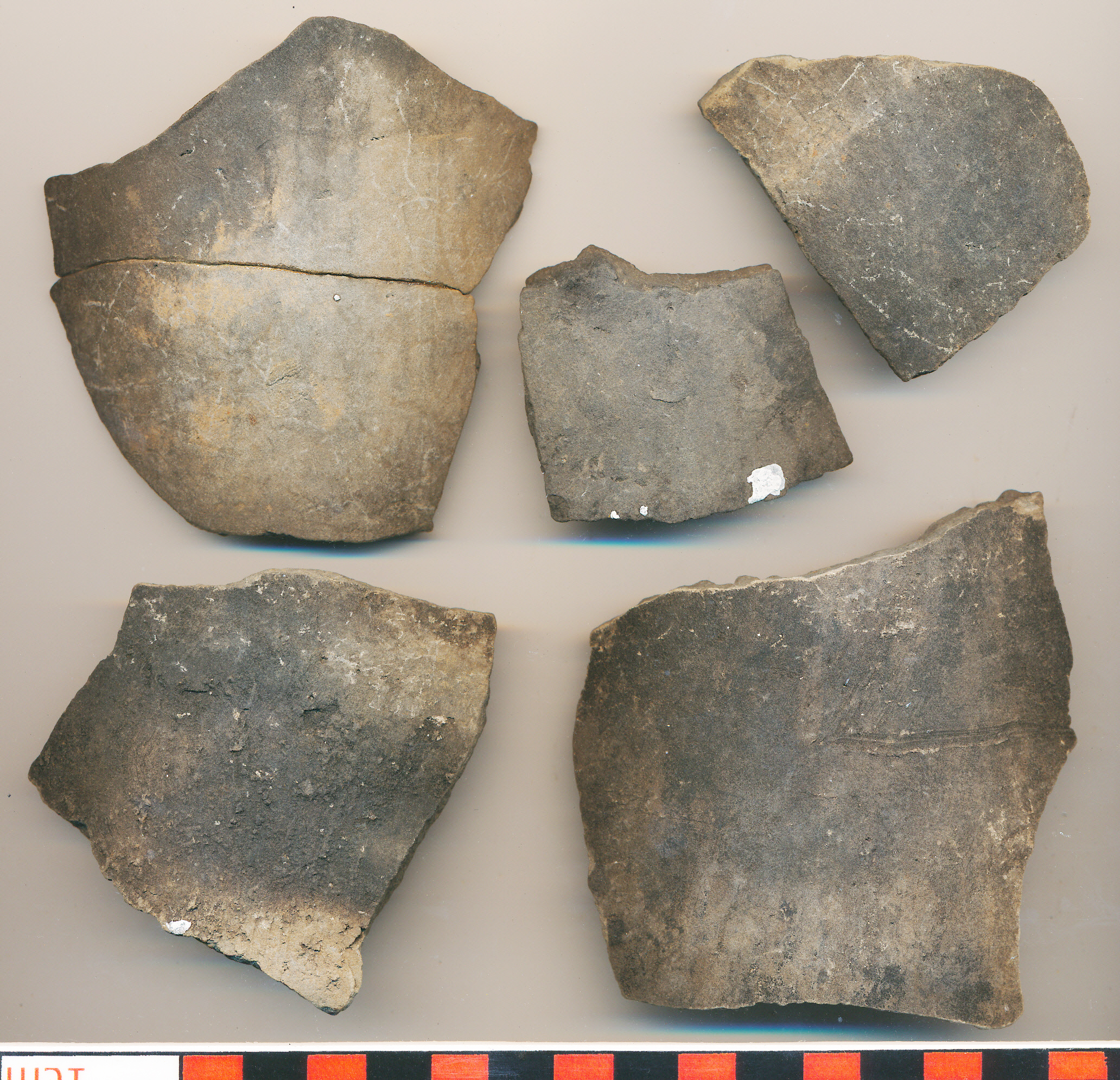 Szürke-fekete foltos, korongolt, kissé homokos anyagú, edények díszítetlen oldaltöredékei.