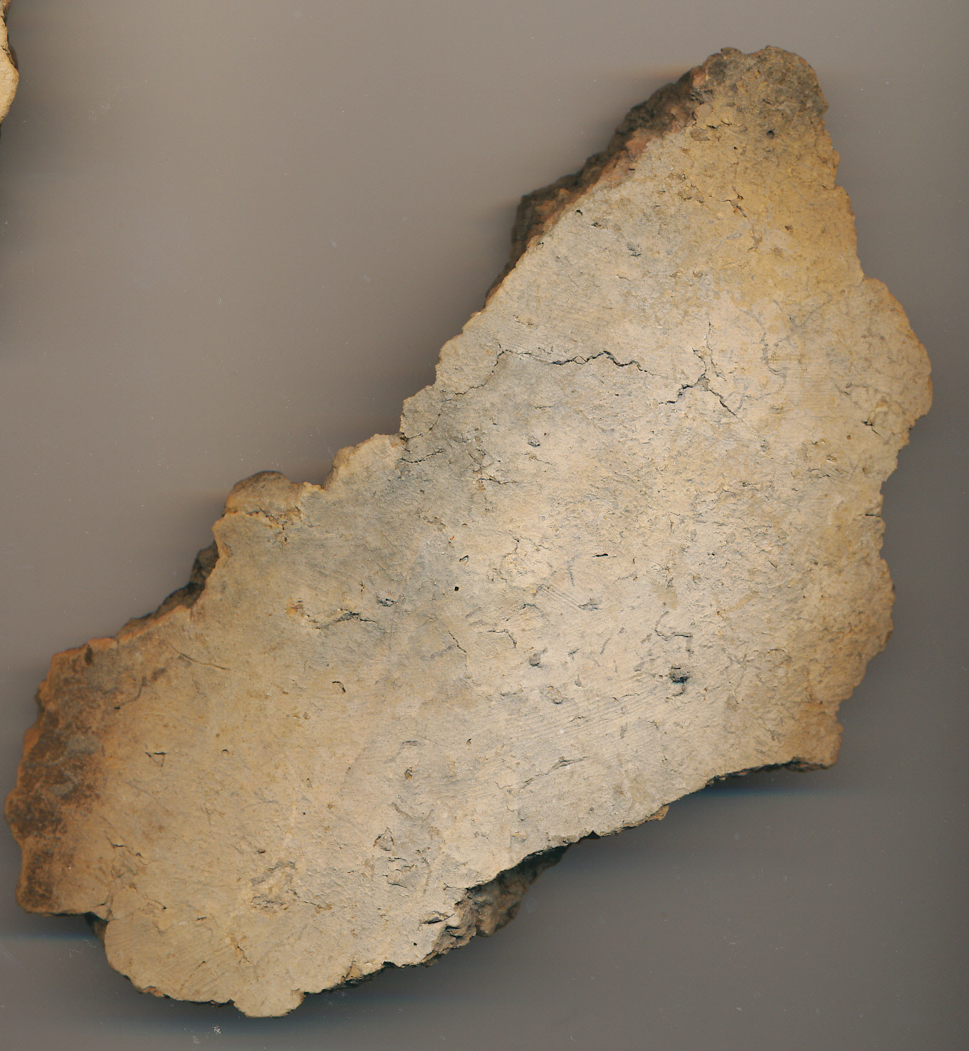 Drapposszürke külső-belső felületű, fekete törésű, nagyobb kerámiaszemcsékkel erősen soványított, korong nélkül készített nagyobb edény enyhén íves oldaltöredéke.