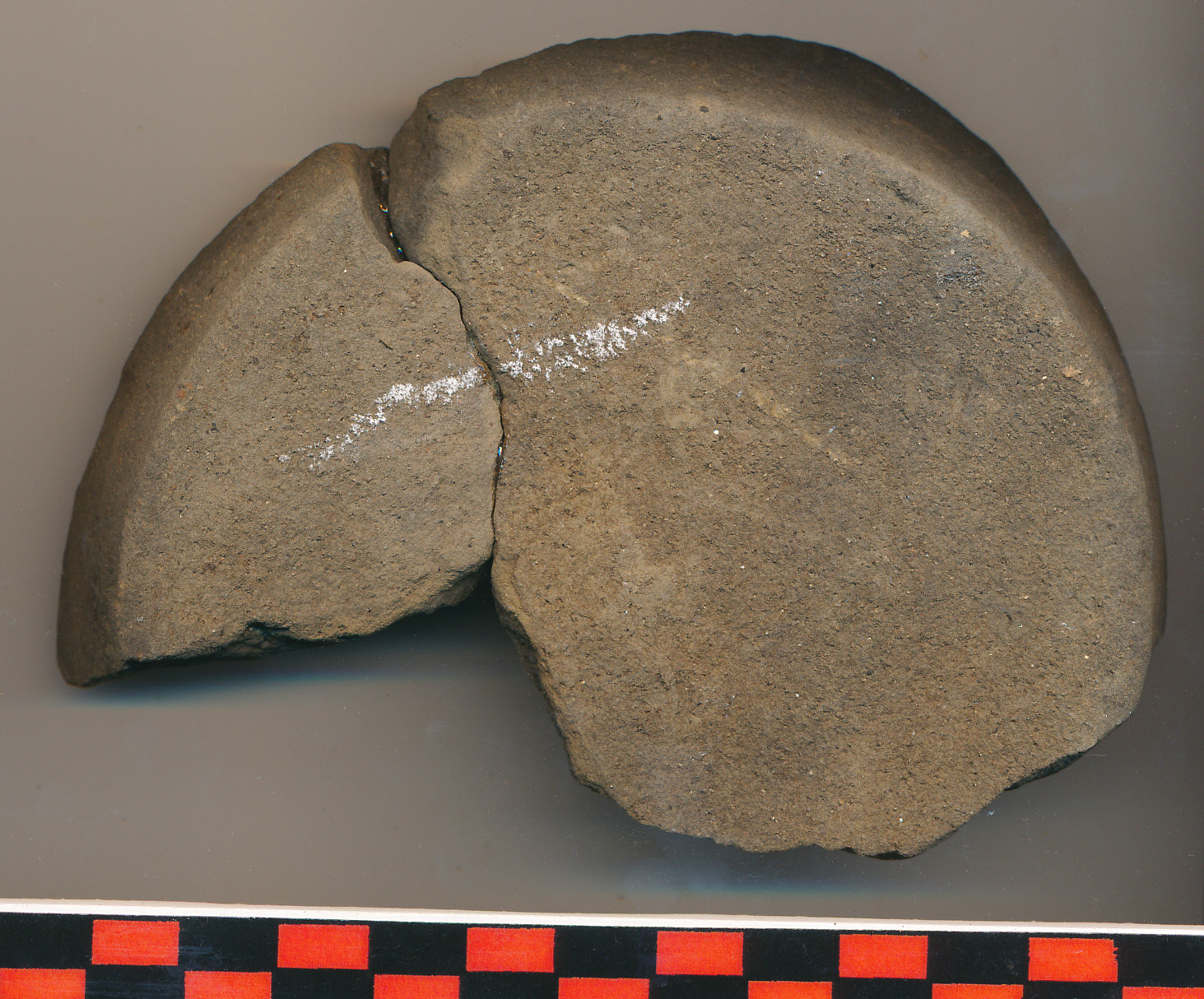 Fekete,homokos anyagú, korongolt, vékony falú edény vágott alja a felmenő fal csonkjával.