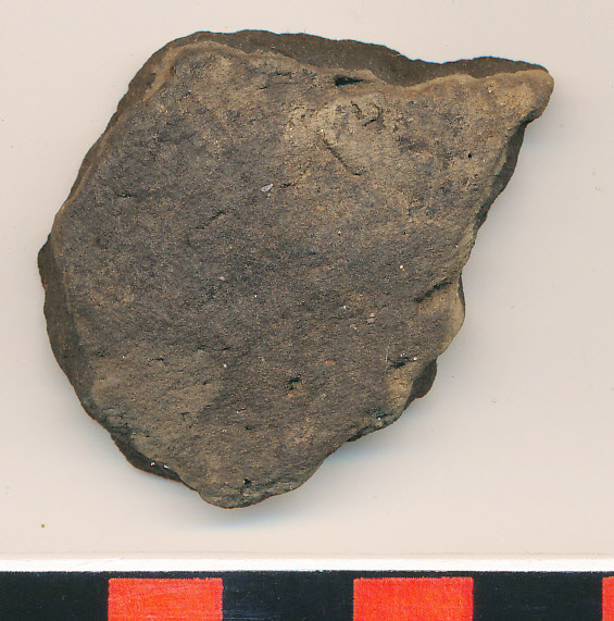 Fekete, kissé érdes tapintású, kissé íves oldaltöredék.