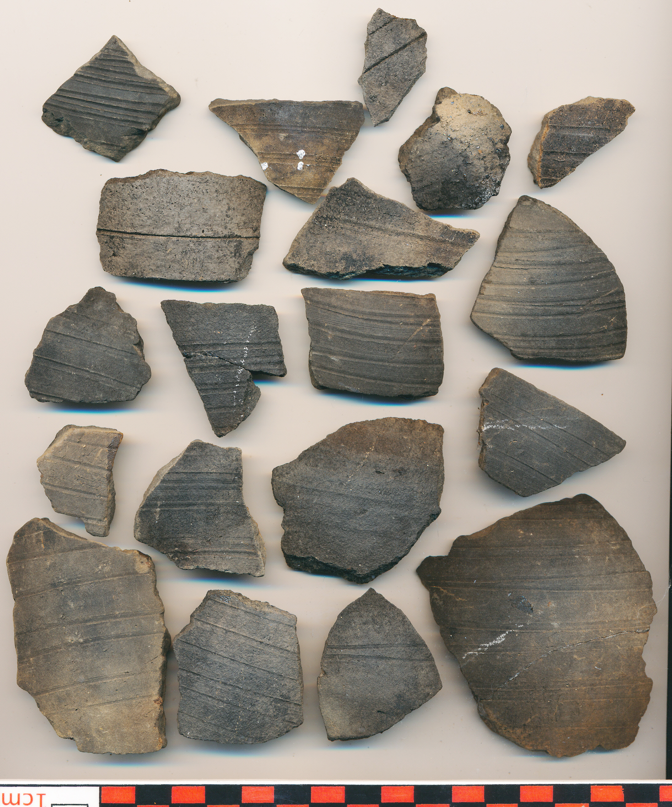 Fekete külső felületű, homokos anyagú, korongolt edények egy-egy oldaltöredéke körbefutó karcolt vonalakkal díszítve. Némelyik barna vagy téglaszínű foltos vagy belső felületű.