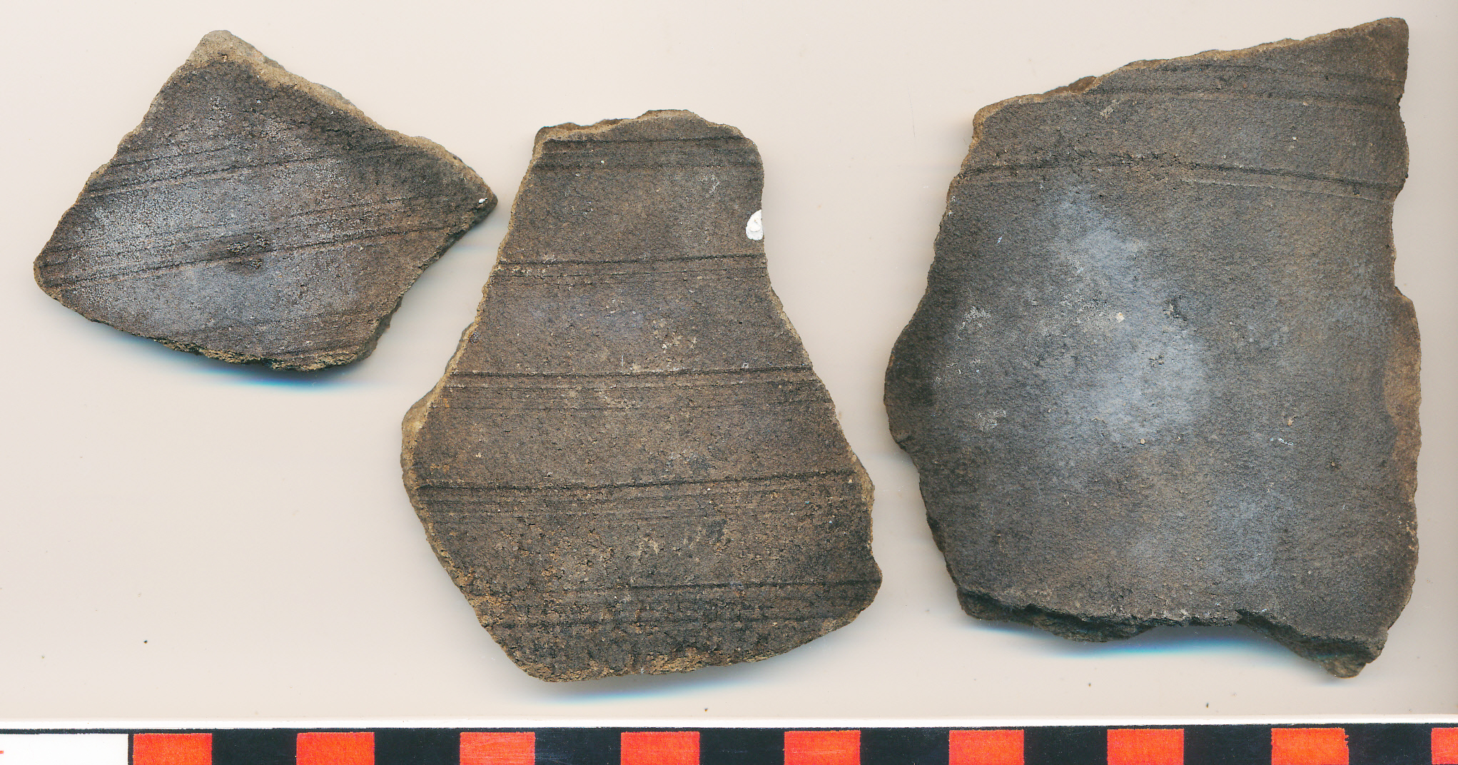 Fekete külső felületű, szürke törésű, homokos anyagú, korongolt nagyobb edény vagy edények vastagabb falú töredékei bekarcolt körbefutó vonalakkal díszítve.