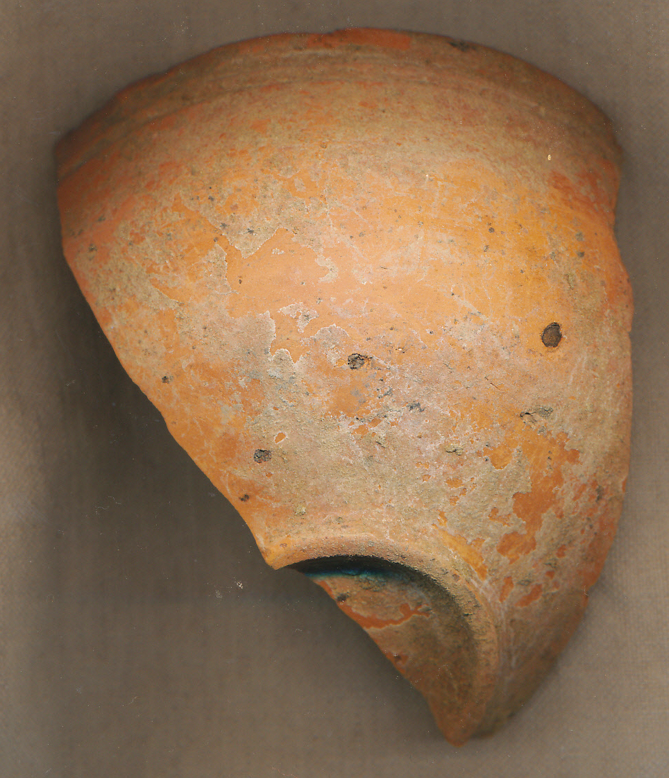 Téglaszínű, korongolt, vékony falú, enyhén duzzadt peremű, perem alattdupla hornyolással tagolt, félgömbös, profilált, alulról erősen homorú talpú kis tál negyede.