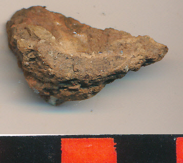 Barna, kerámiazúzalékkal soványított, korong nélkül készített edény apró szilánkja.