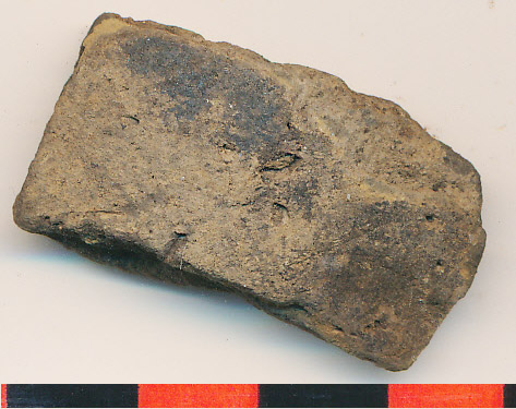 Kívül-belül érdes tapintású barna, kívül fekete foltos, fekete törésű, kisebb edény enyhén íves kisebb oldaltöredéke.