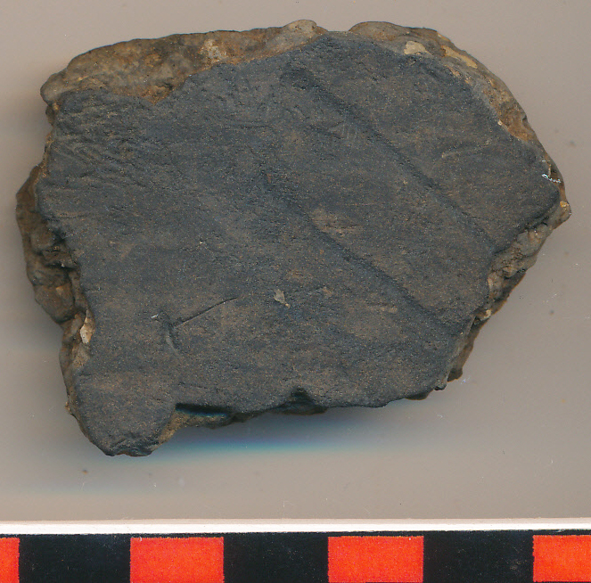Fekete, eldolgozott külső felületű, szürke törésű, kerámiazúzalékkal soványított, omlékony oldaltöredék.