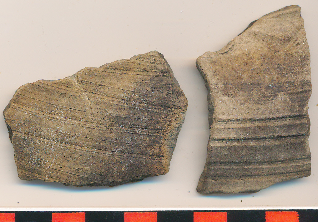 Külső felületén fekete foltos, drappos szürke, szürke törésű, homokos anyagú, korongolt oldaltöredékek sűrű bekarcolt vonalakkal díszítve.