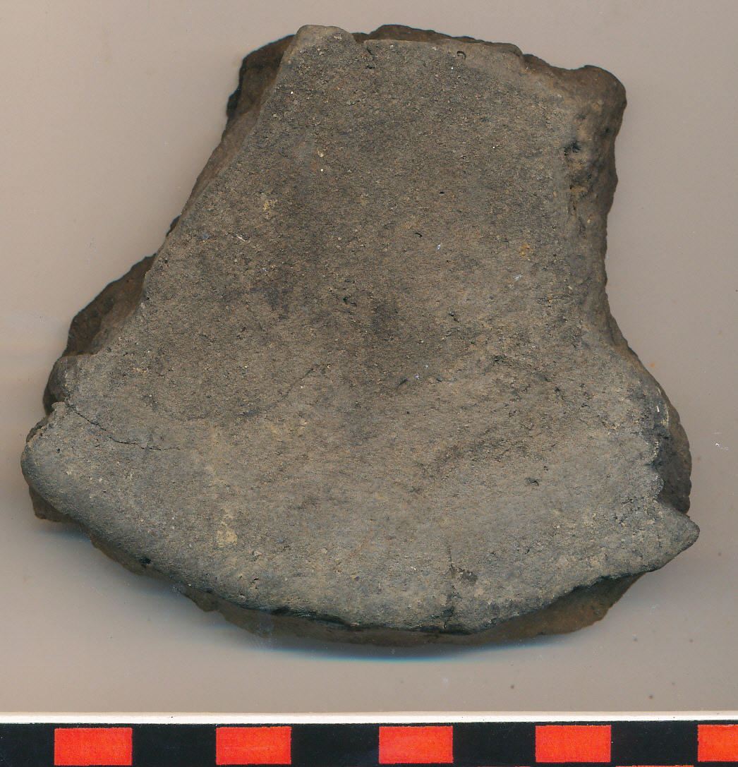 Fekete, kívül barnás foltos, nagyobb edény vágott aljtöredéke a felmenő fal kicsi csonkjával.