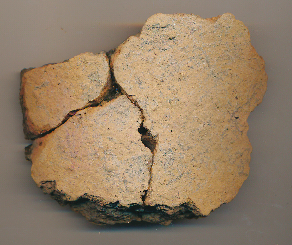 Kívül-belül világos téglaszínű, szürke törésű, kerámiazúzalékkal soványított anyagú, eldolgozott külső-belső felületű, korong nélkül készített edény vastag falú oldaltöredéke 3 darabból ragasztva.