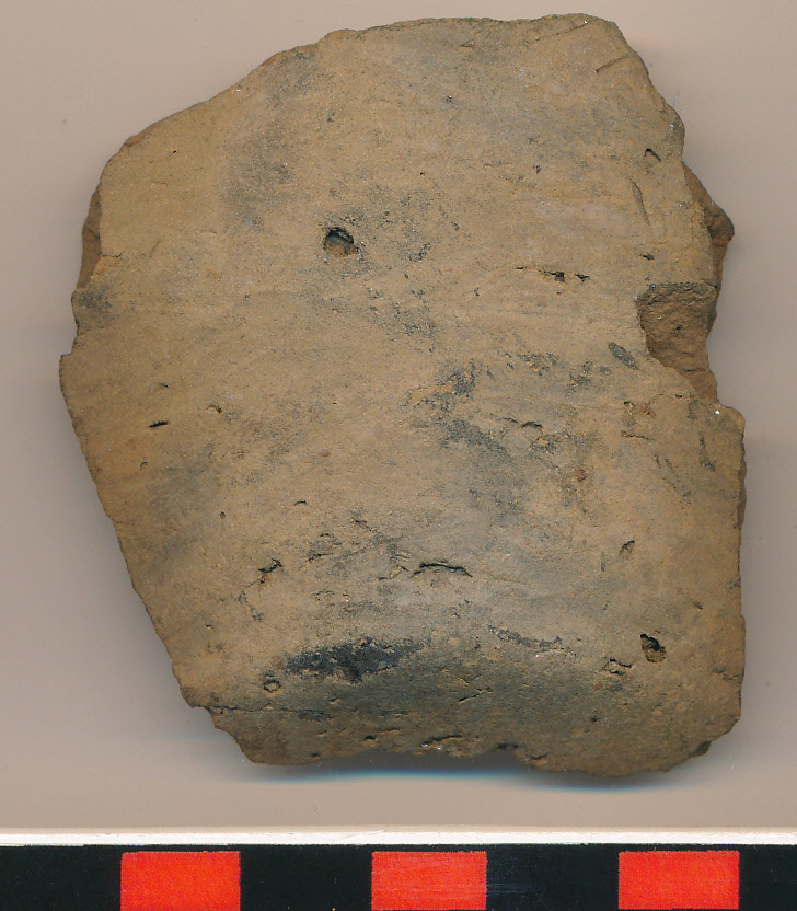 Világos szürkésbarna, jól eldolgozott külső-belső felületű, vékony falú kisebb edény vágott alja és íves felmenő fala.