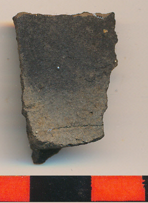 Fekete, kívül szürke foltos, kevés homokkal soványított, korongolt apró oldaltöredék.