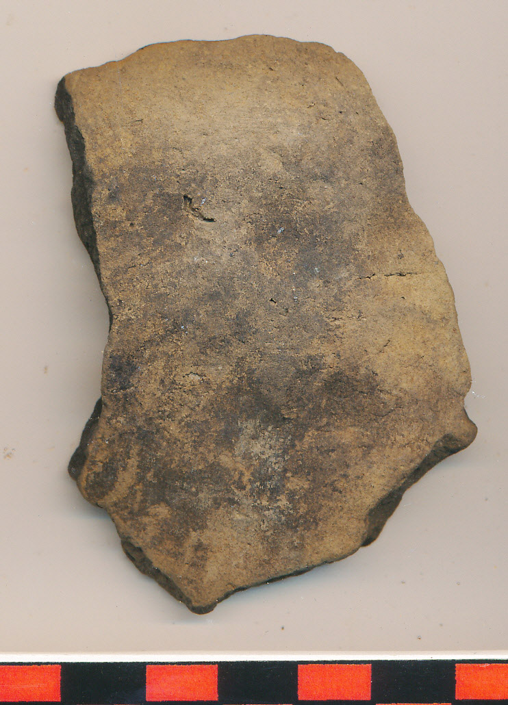 Kívül-belül érdes tapintású szürke, egyenetlen felületű, kívül fekete foltos, fekete törésű oldaltöredék.