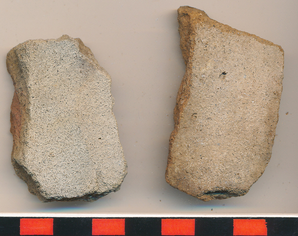 Szürkés drapp, homokos anyagú, korongolt, vastagabb falú edény díszítetlen oldaltöredékei.