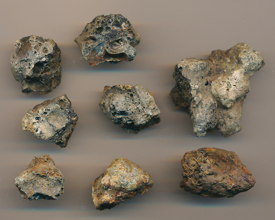 Üveges-hólyagosra égett, szabálytalan alakú sötétszürke, helyenként barna salakdarabok.