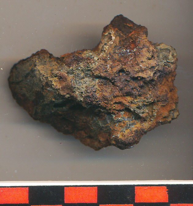 Szabálytalan alakú, szivacsos, nehéz, szürke-barna foltos salakdarab.