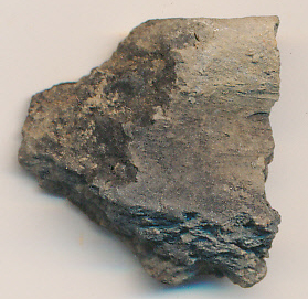 Fekete, egy helyen szürke foltos, korong nélkül készített edény enyhén kihajló apró peremtöredéke.