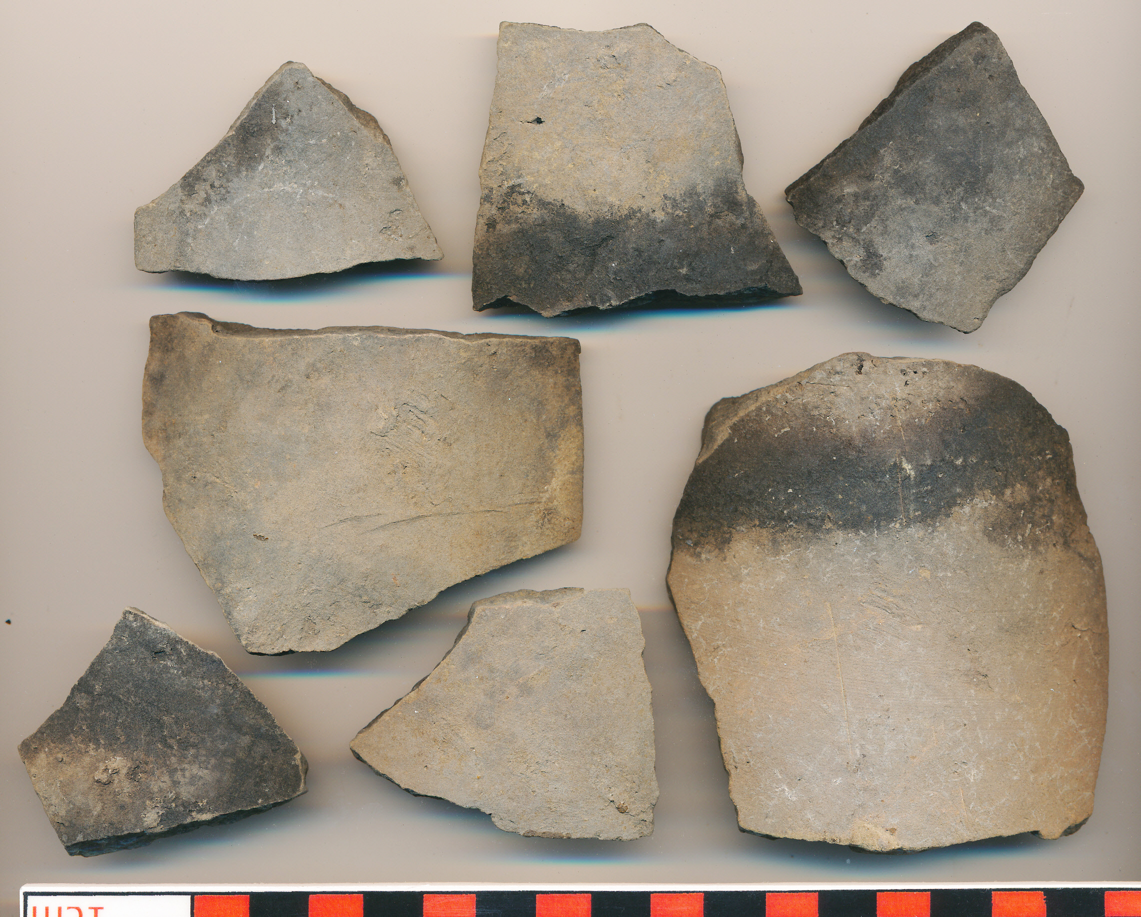 Szürke, illetve barnás, fekete foltos, korongolt, kissé homokos anyagú, díszítetlen oldaltöredékek.