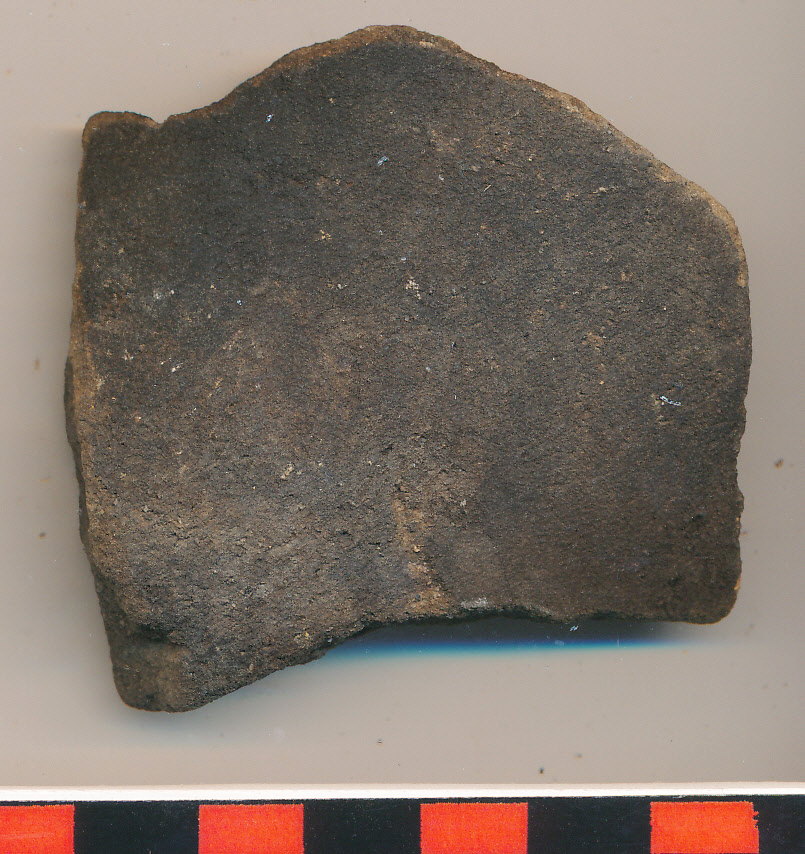 Fekete, törésében barna réteges, homokos anyagú, korongolt, vastag falú edény díszítetlen oldaltöredéke.