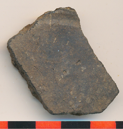 Fekete, simított külső felületű, belsejében letöredezett oldaltöredék sekély benyomott vonallal.