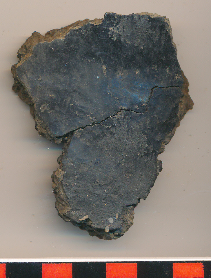 Fényezett fekete külső felületű, szürke törésű, belső felületén eldolgozott, kerámiazúzalékkal soványított edény oldaltöredéke. 2 db-ból ragasztott.