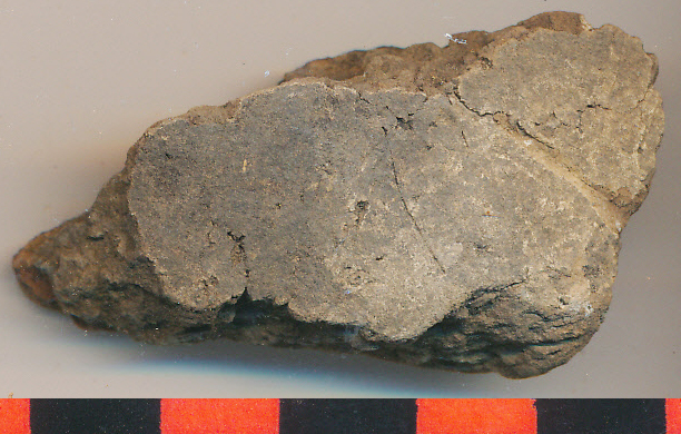 Piszkosszürke, durva kivitelű, belül egyenetlen, letöredezett felületű oldaltöredék.